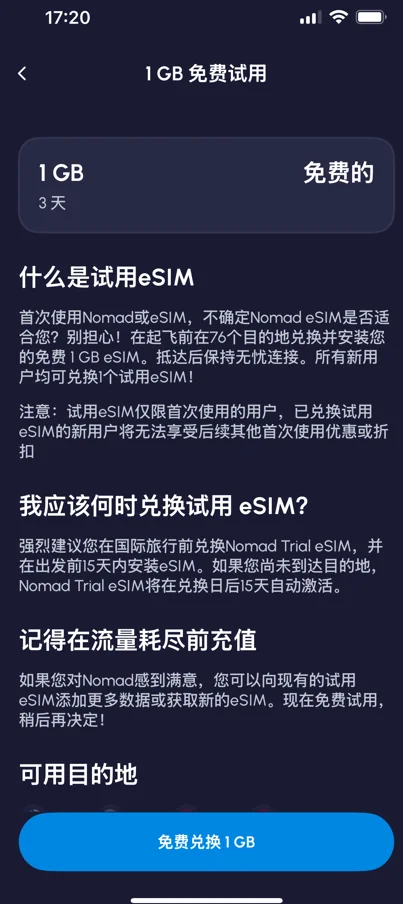 打开应用首页,找到”免费试用”专区,点击兑换免费1GB eSIM。兑换成功后,该试用eSIM将自动添加到你的账号中。